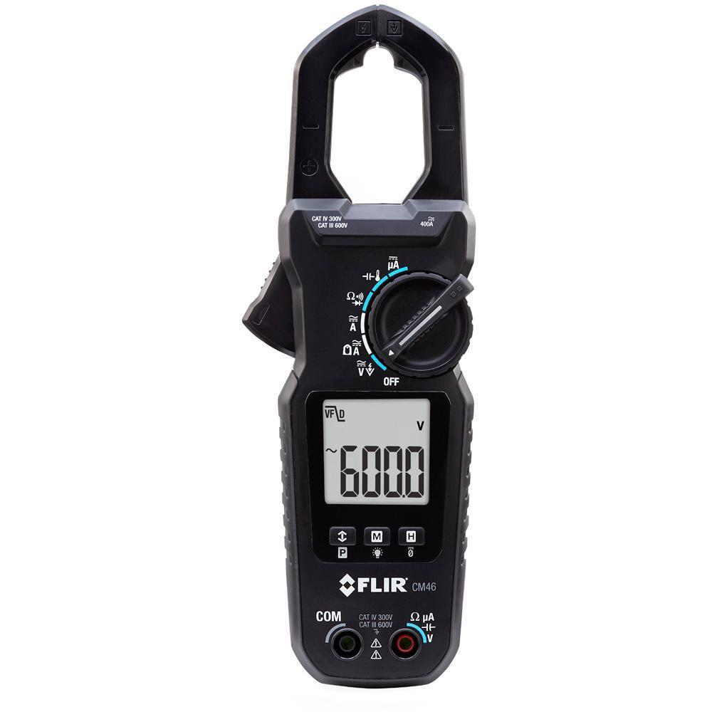 O FLIR CM46 é um alicate amperímetro profissional TrueRMS AC/DC, projetado para medições precisas em correntes até 400 A e tensões até 600 V, com segurança certificada e construção robusta para uso diário em campo.
