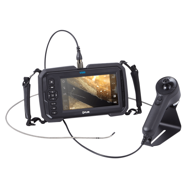 Kit de videoscópio com unidade de visualização e gravação com display sensível ao toque de 7” e resolução de 1024 x 600 pixels, taxa de atualização de 30 Hz, bateria recarregável de Li-Ion com autonomia de 8 horas, registro através de cartão de memória microSD (32 GB incluso), interface de saída de vídeo através de conector micro HDMI, menu multi-línguas, transferência de dados através de porta USB, cartão microSD ou Wi-Fi, gravação de áudio através de plugue padrão de 3,5 mm para microfone (incluso), rosca para montagem em tripé e capacidade de transmitir vídeo ao vivo para dispositivos iOS e Android (com Flir Tools Mobile instalado). Possui grau de proteção IP54, teste de queda de 2 m e temperatura de operação de -10 até 60°C, peso de 1,3 kg e dimensões de 248 x 151 x 52 mm.